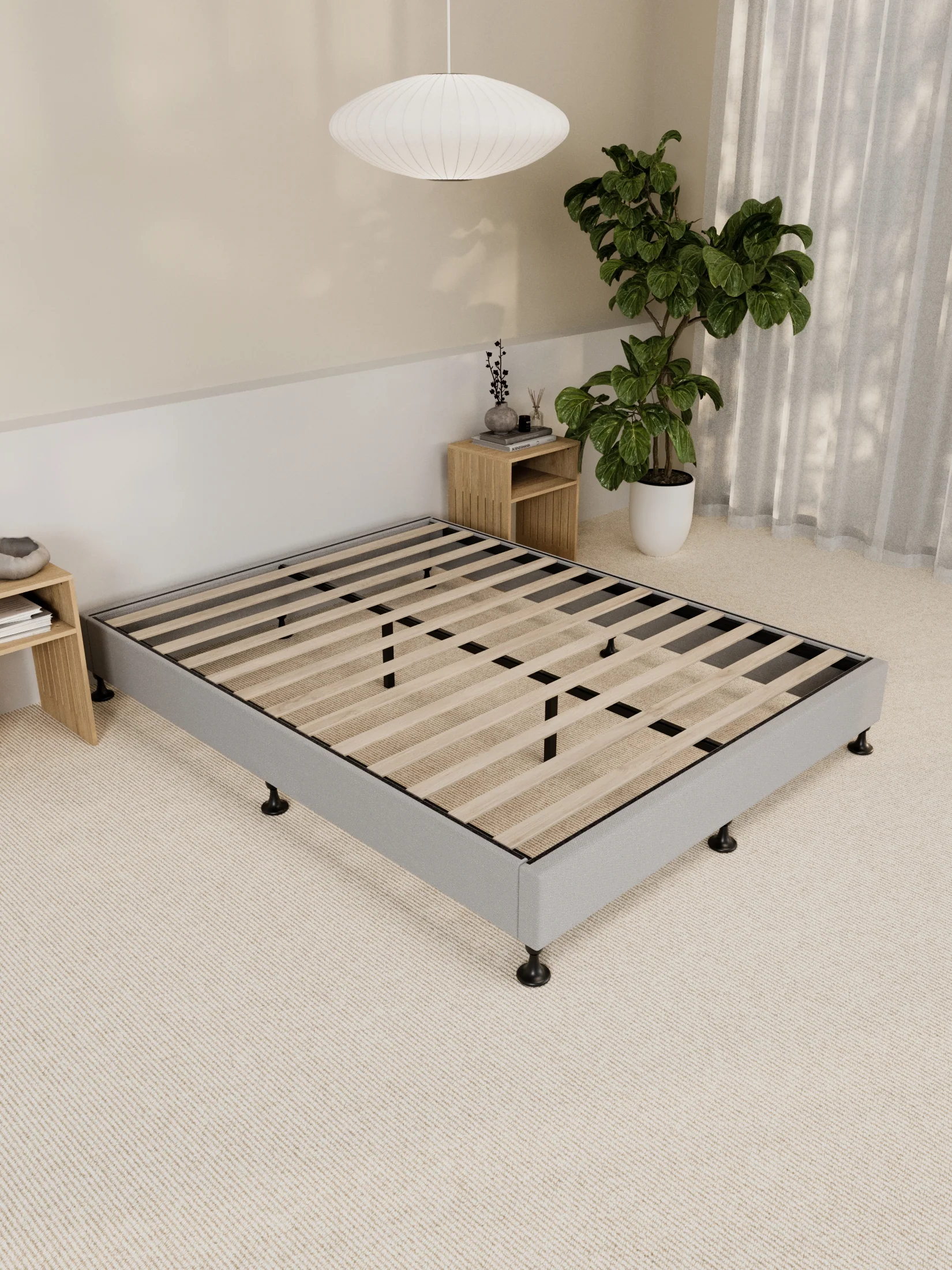 Built with sturdy legs for exceptional support and scratch-free floor protection, the Alexandra Bed Base is designed for long-lasting reliability. Its easy-to-assemble Velcro strip slats ensure a hassle-free setup, so you can enjoy your upgraded sleep space in no time. Experience superior comfort and timeless elegance with the Alexandra Grey Platform Bed Base, exclusively at Ventura Living.