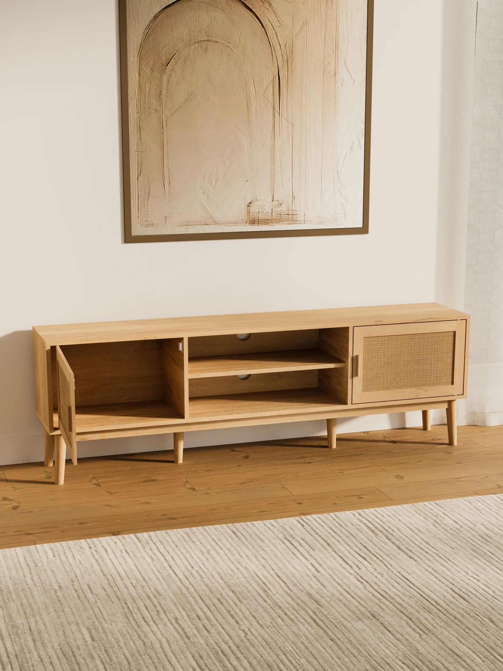 Elevate your living space with the Alfie Natural Rattan Entertainment Unit, where boho-chic charm meets modern functionality. Its elegant rattan accents and warm oak finish create a calming centrepiece for your home. Perfectly crafted, it offers spacious storage with adjustable shelves and roomy side cabinets to organise your media essentials and décor.