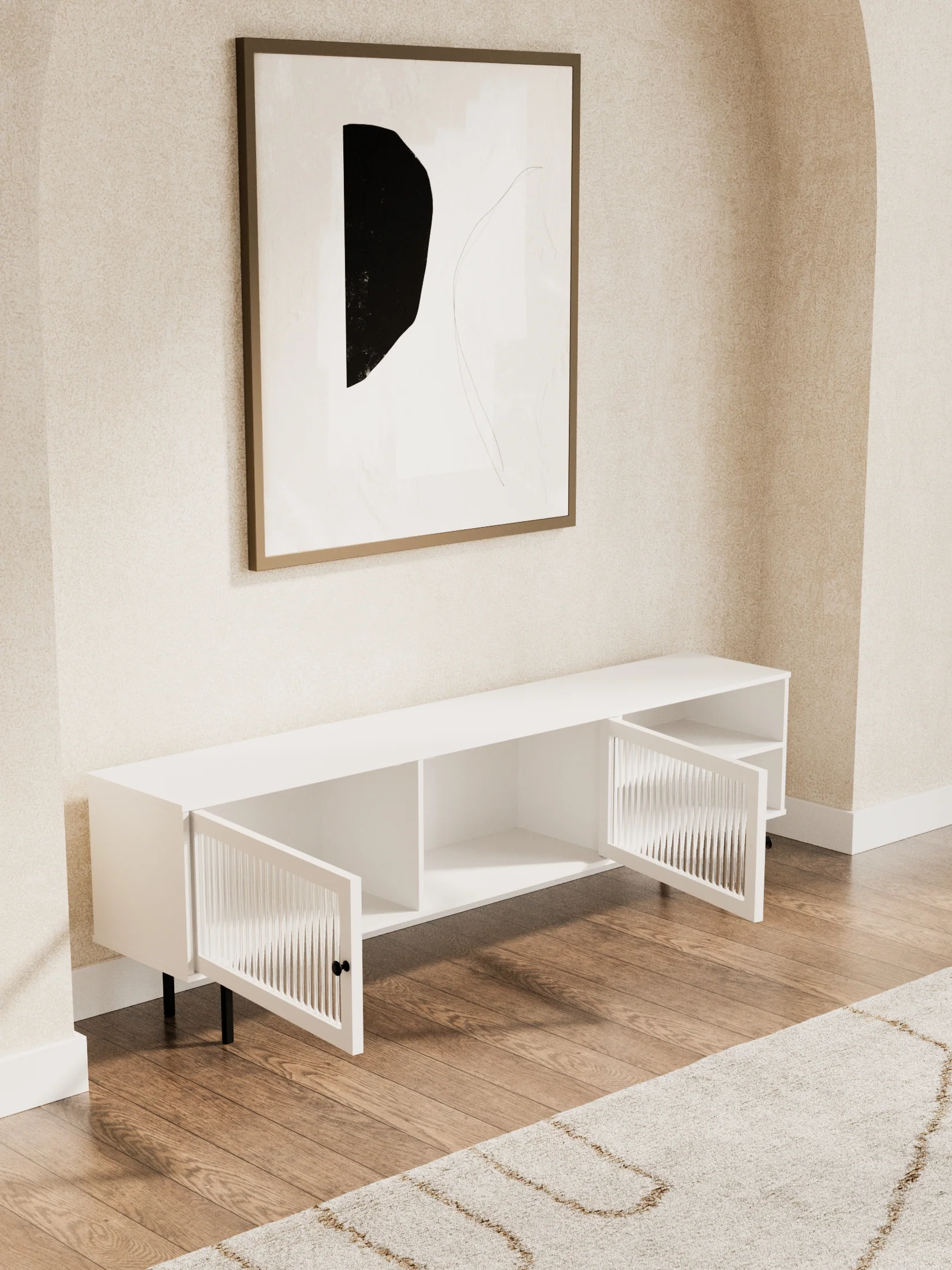 Infuse your home with a sense of charm and sophistication with the Bartlett Retro White Entertainment Unit. Its sleek, minimalist design brings retro-inspired flair, while clean lines and a crisp white finish elevate any living room. Crafted for both beauty and durability, its sturdy frame, tempered-glass cabinet doors, and rust-resistant powder-coated metal legs ensure this piece stands the test of time.